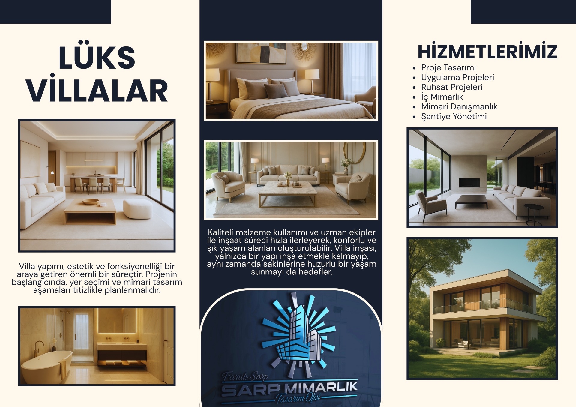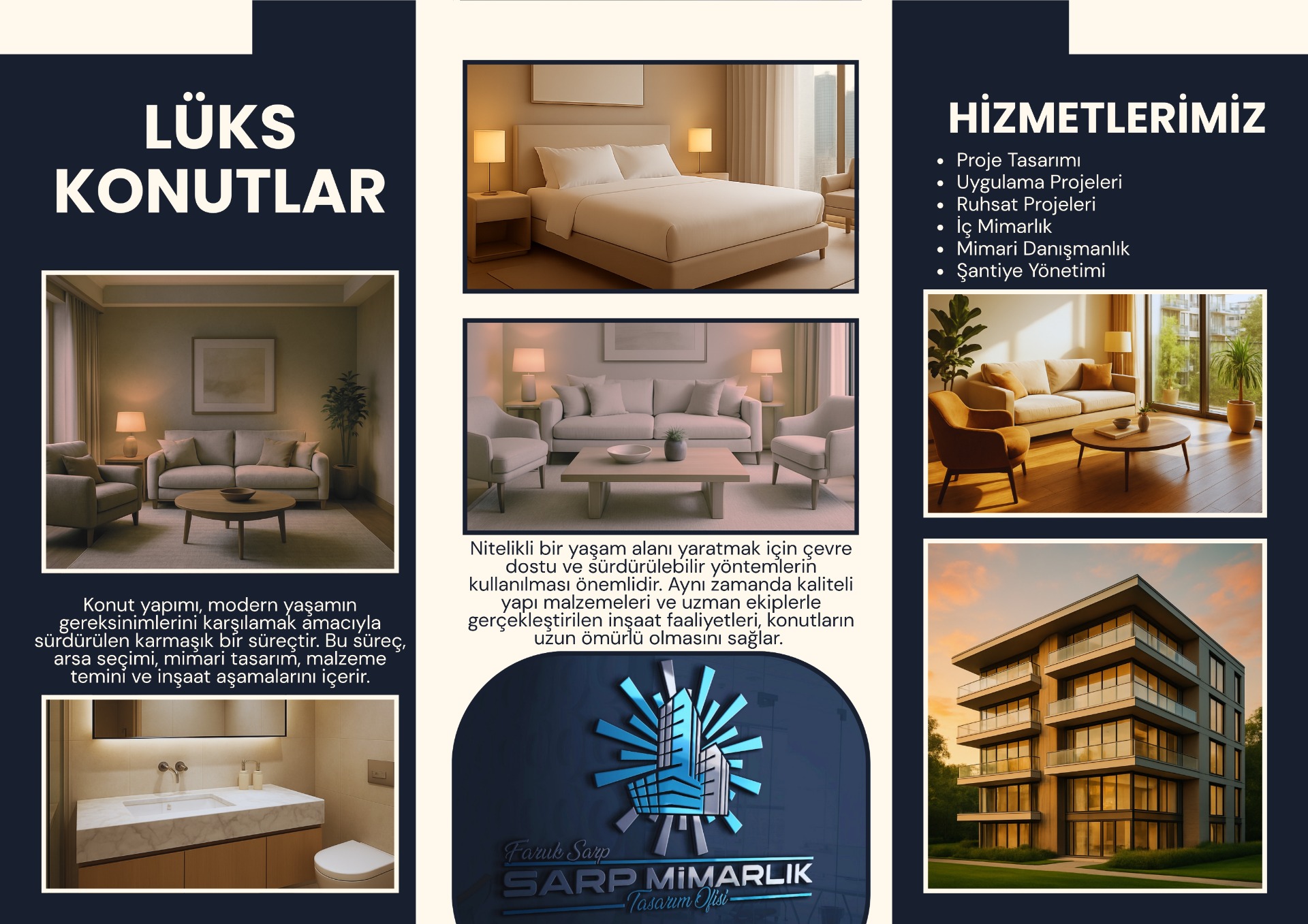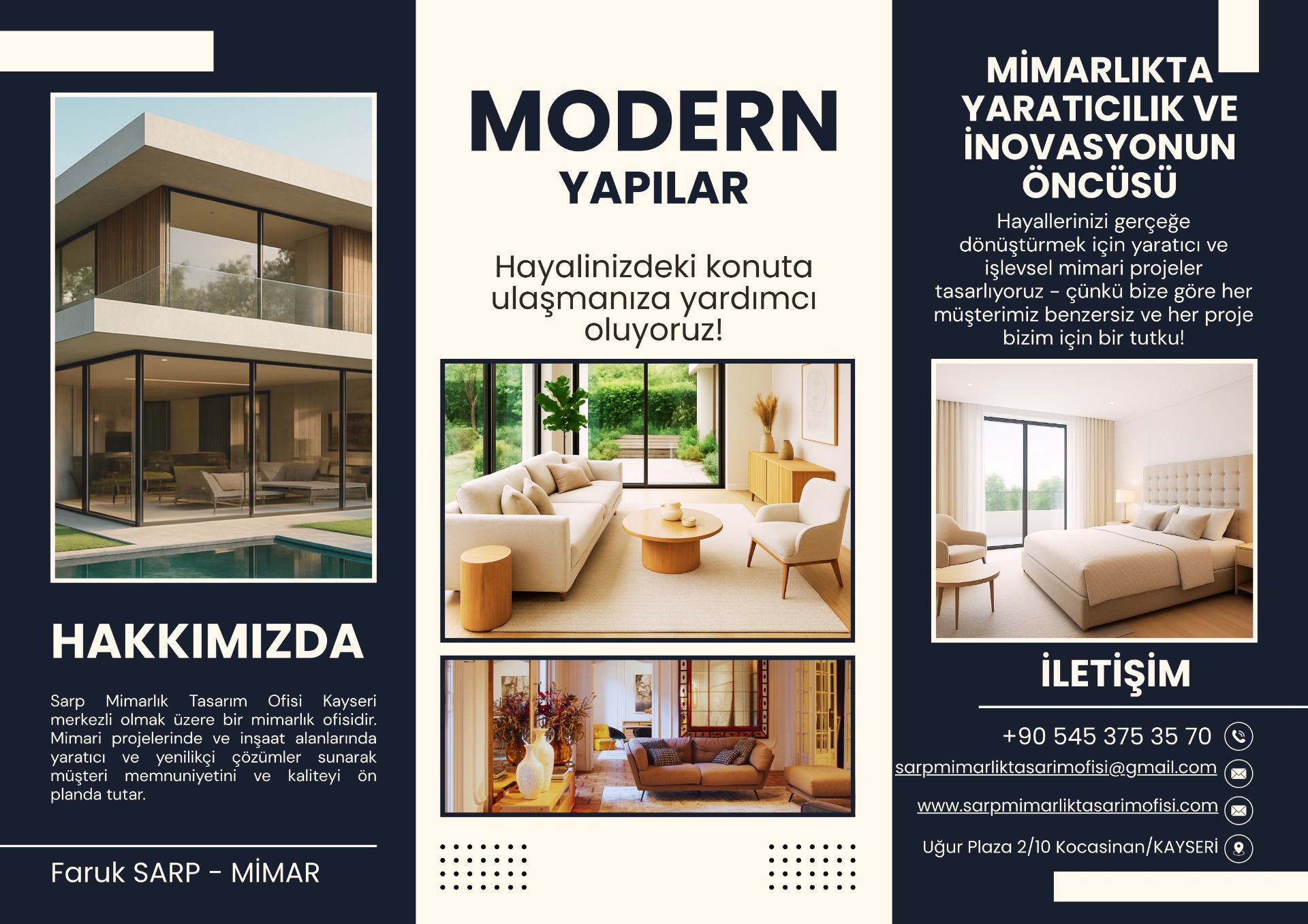 Sarp Mimarlık, Kayseri'de proje tasarımı alanında hizmet veren bir tasarım ofisidir. Müşterilerimizin istekleri doğrultusunda modern ve fonksiyonel tasarımlar oluşturmayı hedefleriz. Profesyonel ekibimizle projelerinizi hayata geçirmek için buradayız.